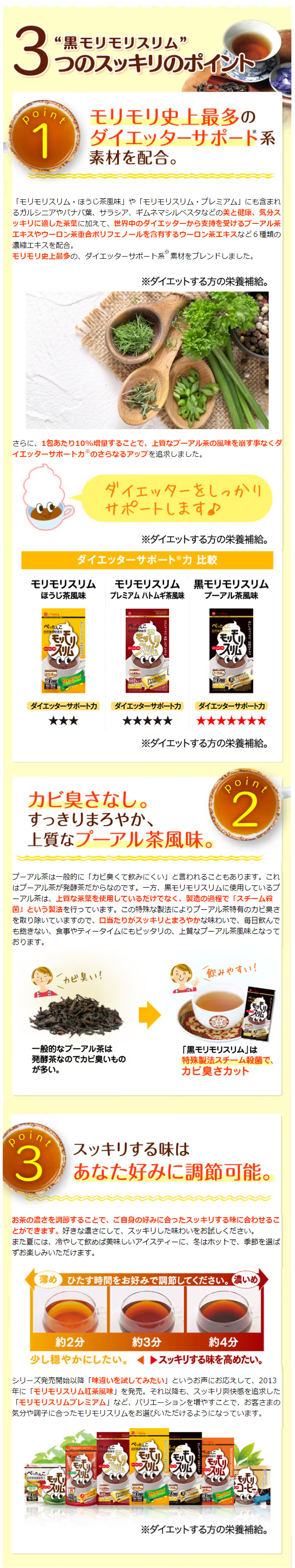 「黒モリモリスリム」は、発売から850万箱(※1)以上の販売実績を誇る、自然美容健康茶モリモリスリムのダイエッターサポート(※2)パワーアップバージョンです。