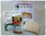 [すずしろ(国産)、すずな(北海道)、はこべら(北海道)、せり(北海道)、なずな(北海道)、ほとけのざ(北海道)、ごぎょう(北海道)、食塩]