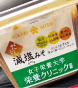 鰹、あご、あじ、昆布の4種のだしをバランスよく合わせ、さらに国産米15割糀ならではの糀の風味を生かした味噌に仕上げました。当社だし入り味噌標準品に比べ塩分を25%カット。