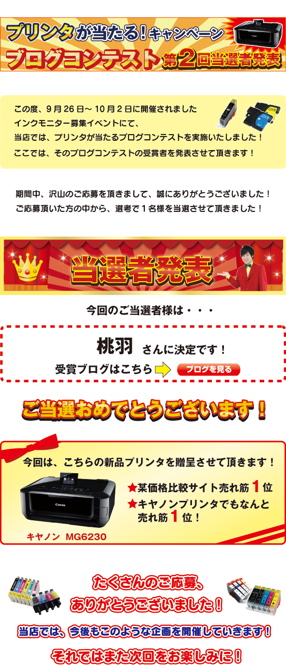 9月に開催された 【プリンタが当たる!】互換インクをモニターしてプリンタをGET【500名様募集】 キャンペーンにて、モニター当選いただいた皆様から寄せられた紹介ブログの中で、最優秀ブログに選ばれたブログを紹介しているページです。