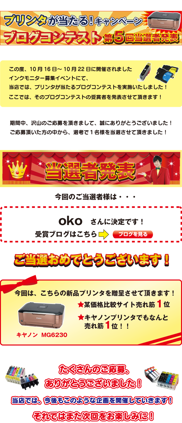 10月に開催された 【ブログを書いてプリンタを当てよう!】インクモニター500名大量募集中! キャンペーンにて、モニター当選いただいた皆様から寄せられた紹介ブログの中で、最優秀ブログに選ばれたブログを紹介しているページです。