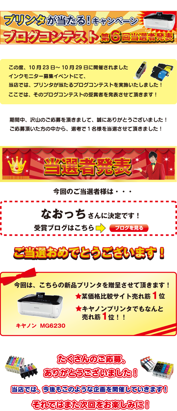 10月に開催された 【ブログを書いてプリンタが当たるチャンス!】500名のインクモニター大量募集! キャンペーンにて、モニター当選いただいた皆様から寄せられた紹介ブログの中で、最優秀ブログに選ばれたブログを紹介しているページです。