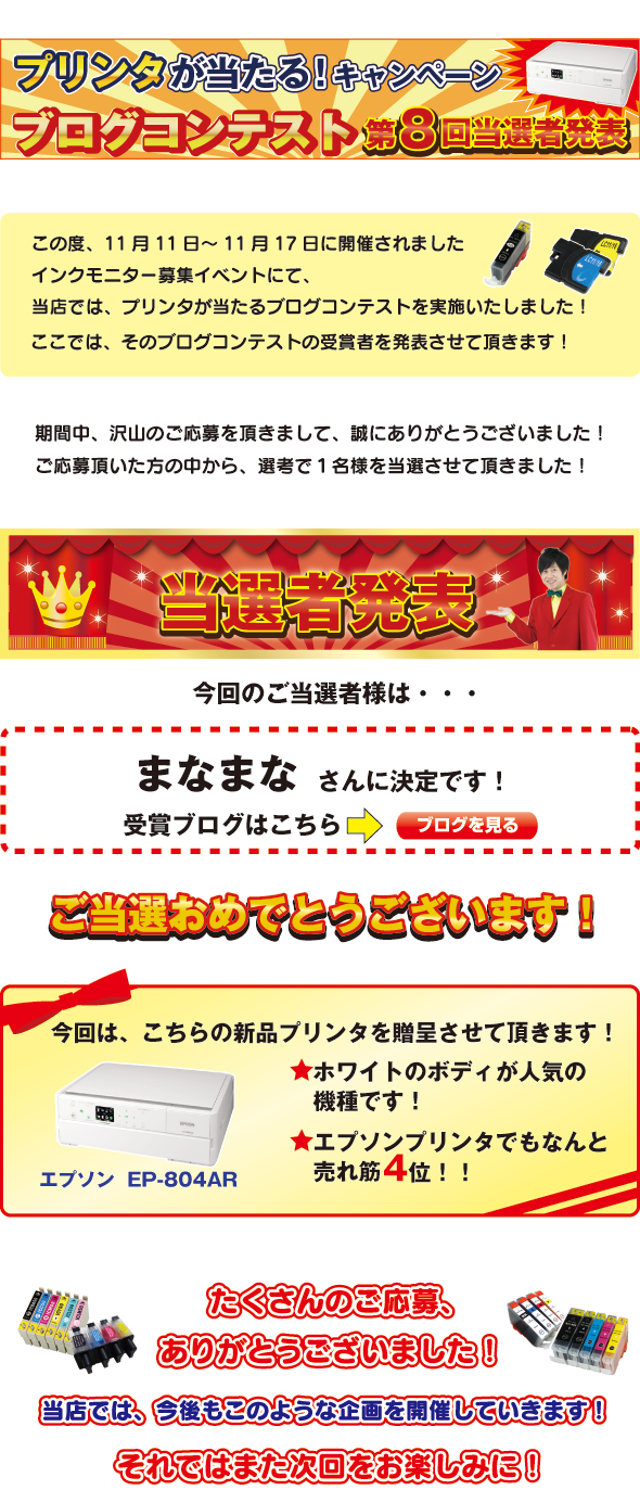 11月に開催された プリンタが当たる!!インクをモニターして、プリンタをGET!500名募集11-2 キャンペーンにて、モニター当選いただいた皆様から寄せられた紹介ブログの中で、最優秀ブログに選ばれたブログを紹介しているページです。