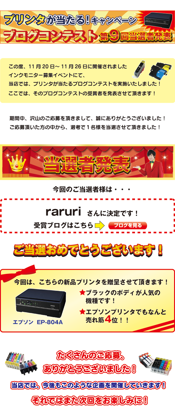 11月に開催された プリンタが当たる!!インクをモニターして、プリンタをGET!500名募集11-3 キャンペーンにて、モニター当選いただいた皆様から寄せられた紹介ブログの中で、最優秀ブログに選ばれたブログを紹介しているページです。