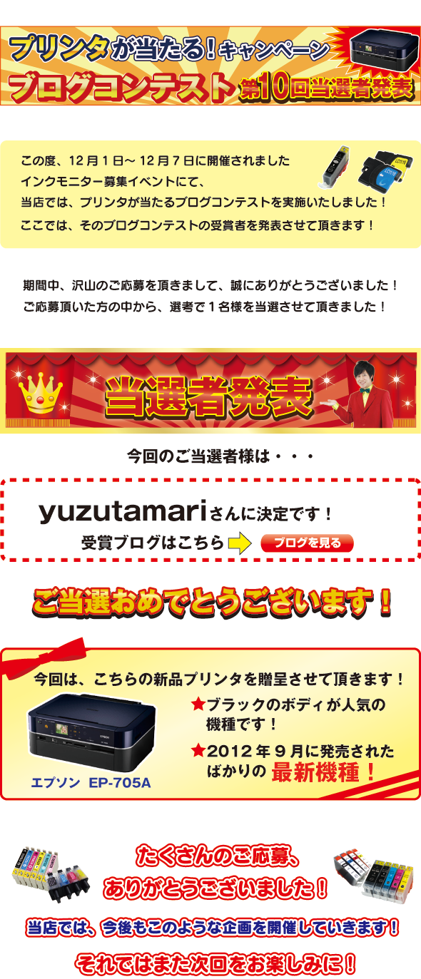 12月に開催された プリンタが当たる!!インクをモニターして、プリンタをGET!500名募集12-1 キャンペーンにて、モニター当選いただいた皆様から寄せられた紹介ブログの中で、最優秀ブログに選ばれたブログを紹介しているページです。