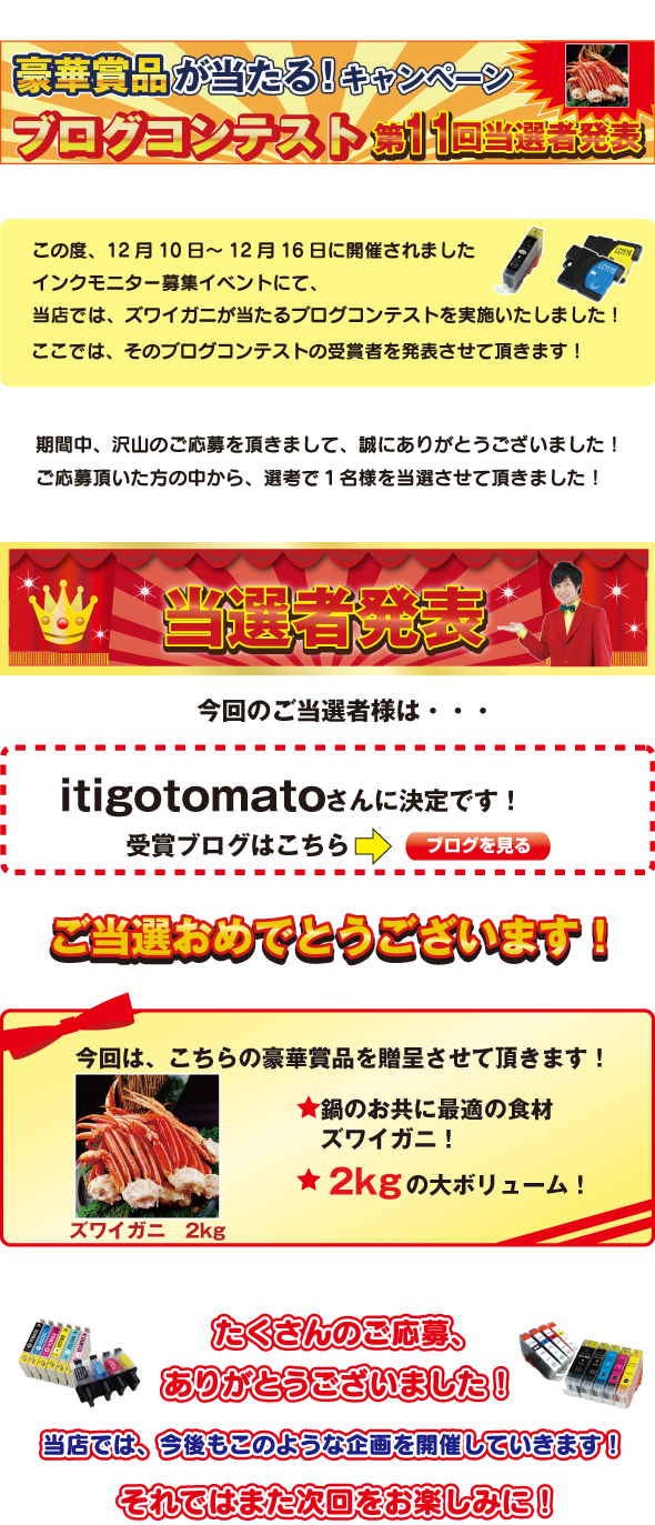 12月に開催された カニ2㎏が当たる!!クチコミで話題のインクをモニターしてカニをGET!12-2 キャンペーンにて、モニター当選いただいた皆様から寄せられた紹介ブログの中で、最優秀ブログに選ばれたブログを紹介しているページです。