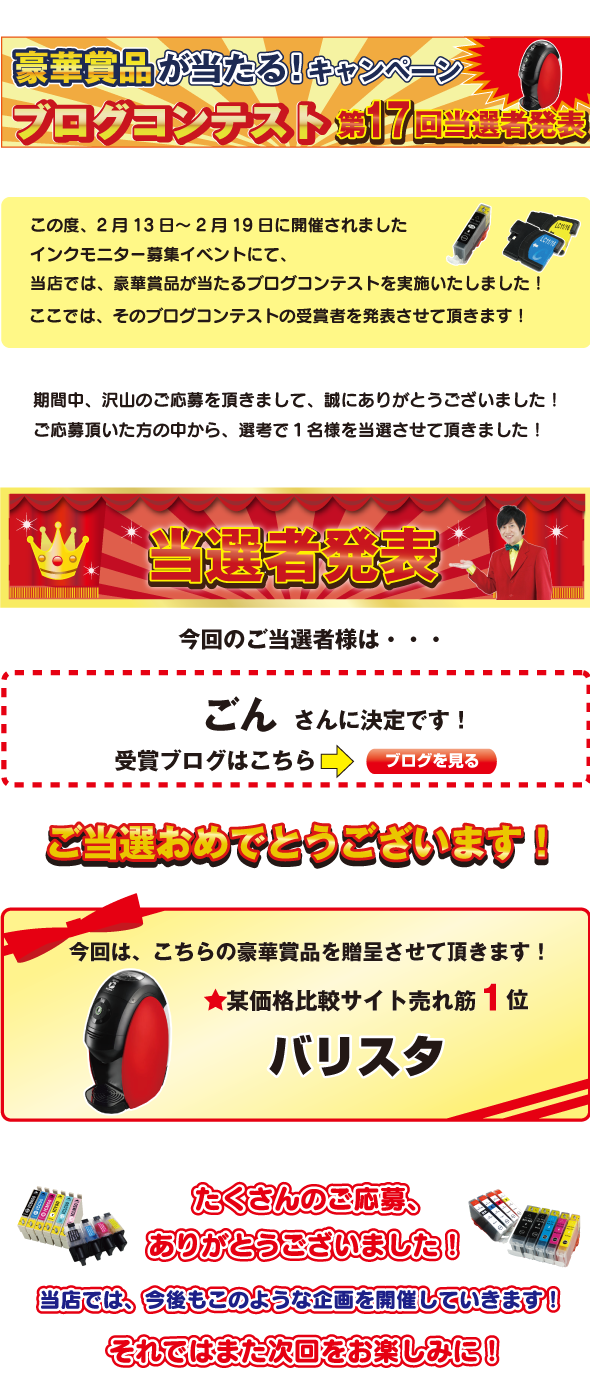 2月に開催された バリスタが当たる!!インクをモニターして、バリスタをGET!500名募集2-2 キャンペーンにて、モニター当選いただいた皆様から寄せられた紹介ブログの中で、最優秀ブログに選ばれたブログを紹介しているページです。