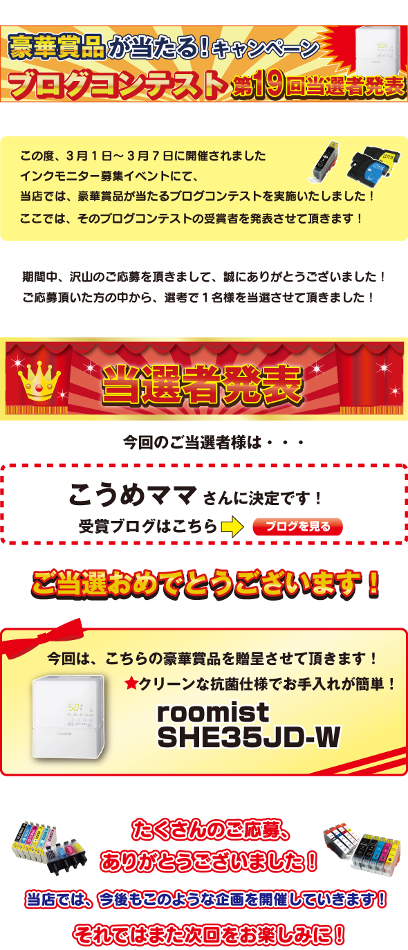 3月に開催された 最新加湿器が当たる!!インクをモニタして、賞品をGET!500名募集3-1 キャンペーンにて、モニター当選いただいた皆様から寄せられた紹介ブログの中で、最優秀ブログに選ばれたブログを紹介しているページです。