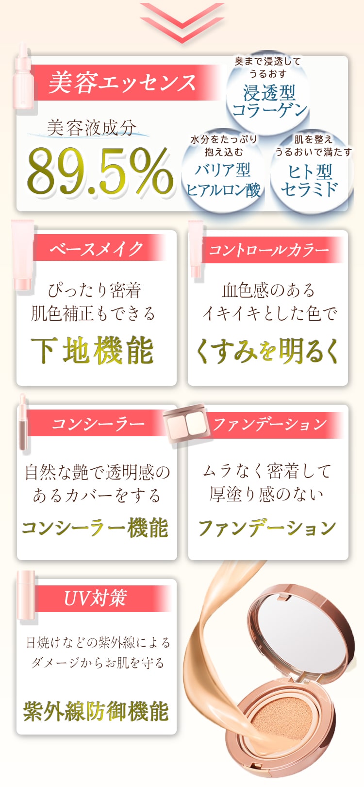 6役1品の美容液クッションファンデーション これ1つで6役(美容エッセンス、メイクベース、コントロールカラー、コンシーラー、ファンデーション、UVケア)を叶える、ハイカバーのクッションタイプのファンデーション。美容液成分89.5%で、素肌からうるおします。”ポンポンポン”と優しく肌にタップするだけで、あっという間にメイク完了!時短にも嬉しいアイテムです。 レビュー数 : 274 |