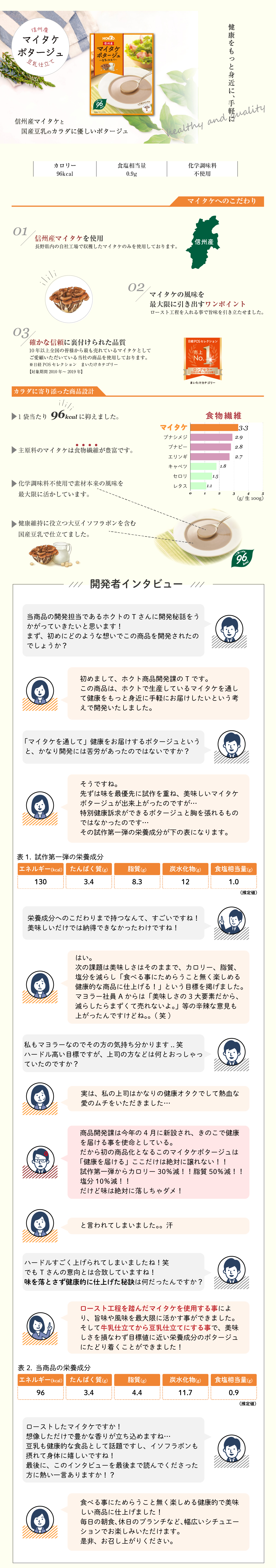 【10月15日きのこの日に新発売しました】自社マイタケ工場で収穫したマイタケと、国産豆乳使用でヘルシーに仕上げています。1人前(160g)あたり、96カロリー!信州産マイタケを使用した健康的で美味しいきのこスープはいかがでしょうか。