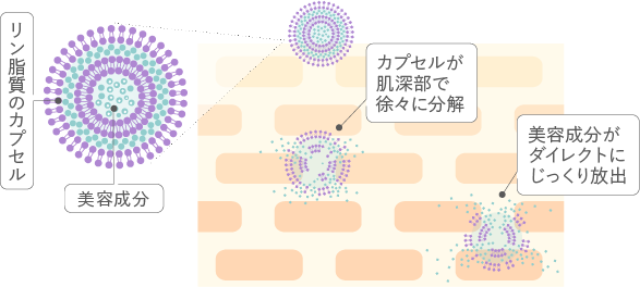 それを実現したのが「リポソーム構造」。有効成分が肌のバリア機能を通り抜け、必要なところにしっかり届きます!