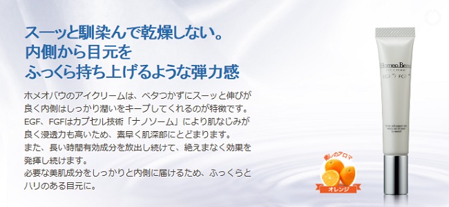 ホメオバウ アイクリームにはナノソーム化されたEGF、FGFが配合されているので、肌なじみが良く素早く浸透して肌深部にとどまり、長い時間有効成分を放出し続けて、絶えまなく効果を発揮し続けます。
