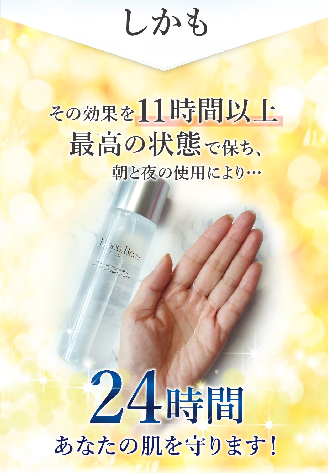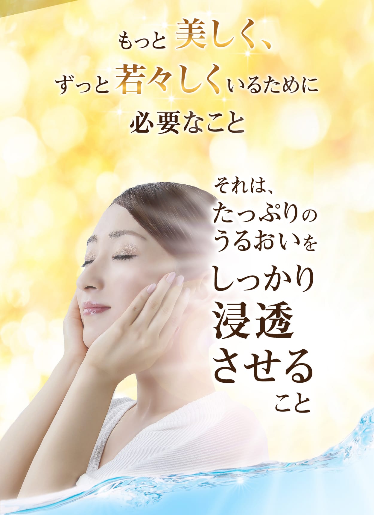 コラーゲン、ヒアルロン酸、エラスチンとアミノ酸が肌にハリを潤いを与え、フラーレン(整肌成分)が美しい肌へ導きます。年齢と共に衰えたお肌に働きかけみずみずしくはずむようなお肌へ導きます。