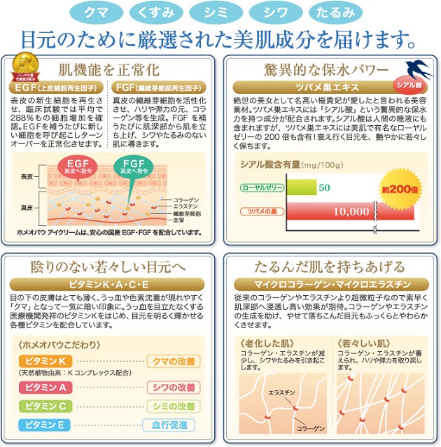 そんなEGF、FGFにくわえ、話題のレチノール*3や、驚異的な保水力を持つツバメの巣エキス*4など、大人の目元にうれしい成分が配合されています。