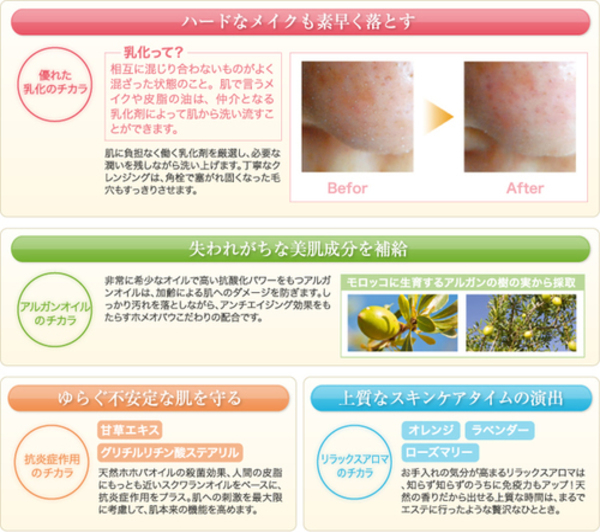 「アルガンオイル」「ホホバオイル」「スクワランオイル」のお肌に優しいオイルを配合しているので、クレンジングしながら美しくなることができます。