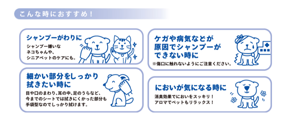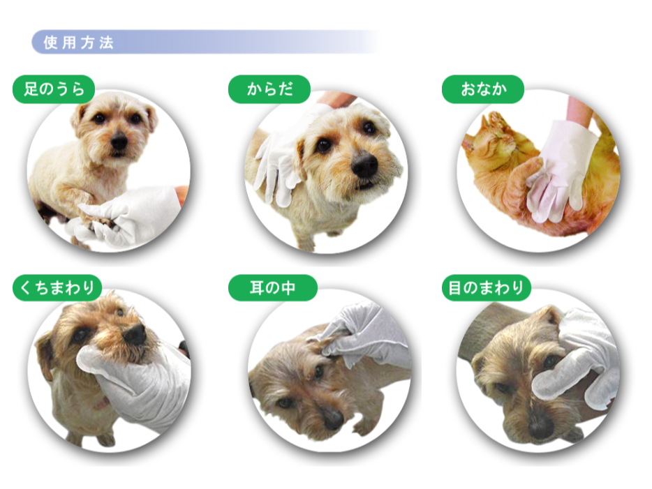 使用上の注意:●ペットのお肌に異常がある場合、お肌に合わない場合には直ちにご使用をお止めください。 ●ペットの目、鼻、口に入らないよう注意してください。 ●この商品は水に溶けませんので、トイレには流さないでください。 ●乳幼児の手の届かないところに保管してください。 ●直射日光や高温は避けて保管してください。 ●1枚で拭き取れるペットの目安体重は7kg以下です。 ●本製品の仕様は予告なく変更することがあります。
