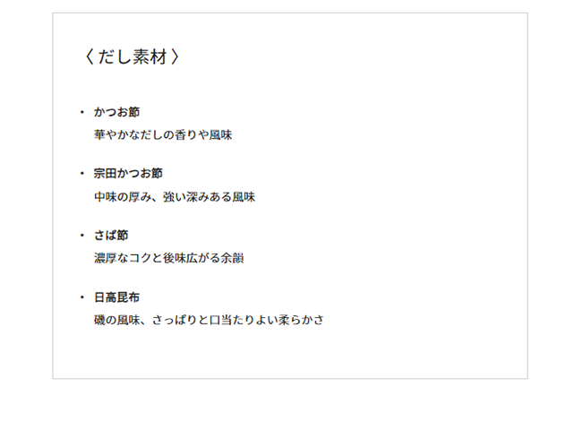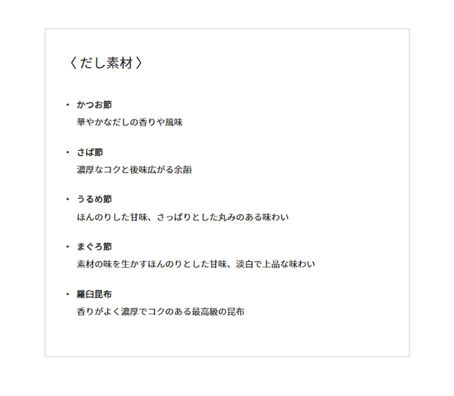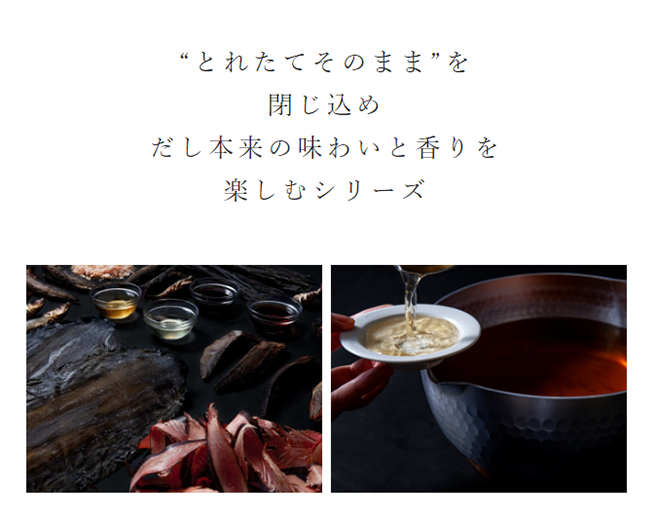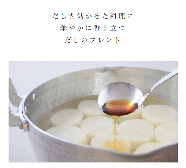 キッコーマンが長い歳月をかけて磨き上げてきたしょうゆのブレンド技術とかえし製法がだしをこれ以上ないほど生かしきる。だし本来の味と香りを、とれたてそのままに感じていただきたい。本シリーズはその思いから生まれた、ブレンダーの誇りを賭けた逸品です。