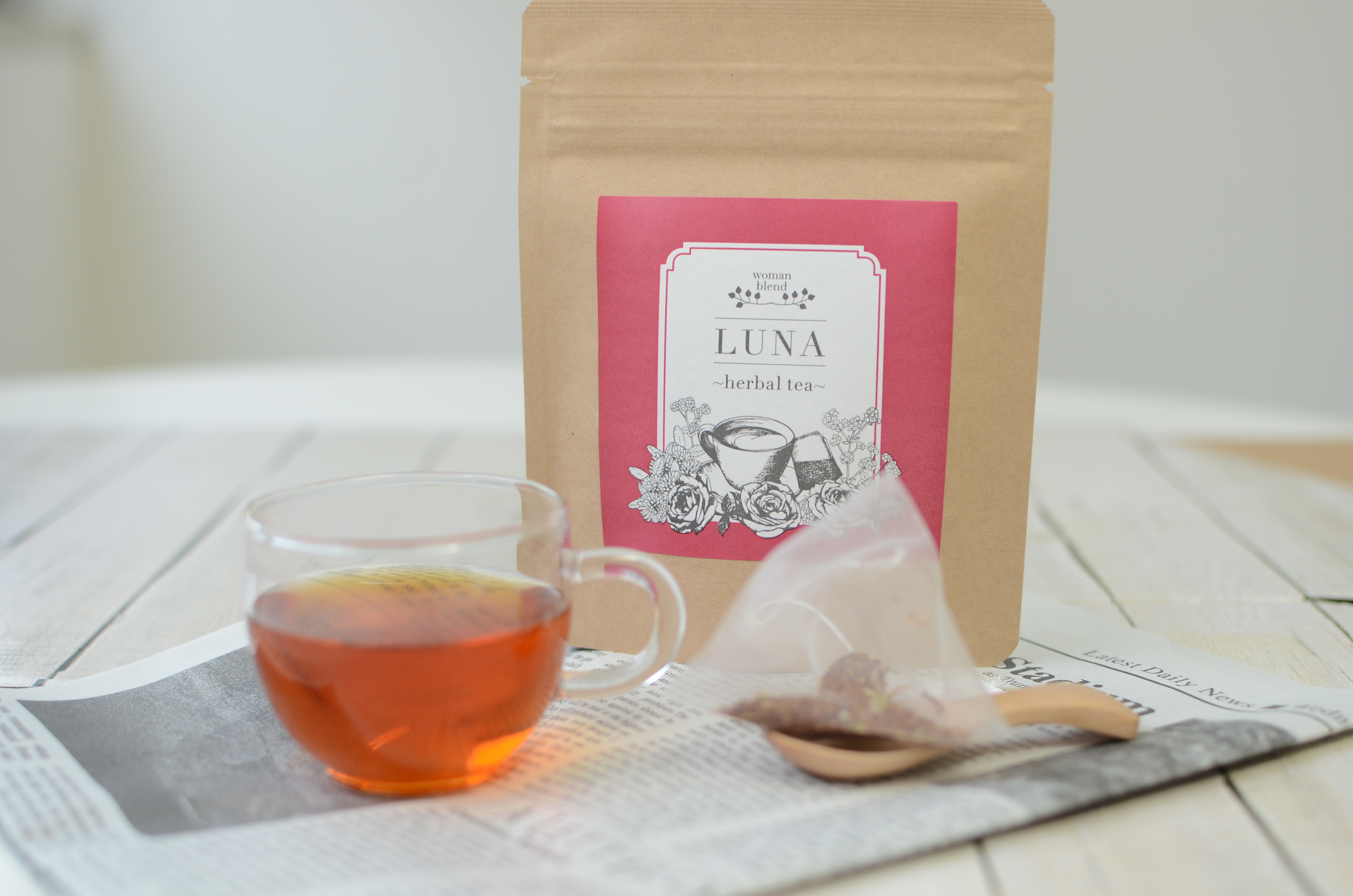 LUNAハーバルティーは、ルイボスティーをベースに、女性らしさを高めるローズレッド、レッドクローバー、カモミール、フェンネルを配合した、