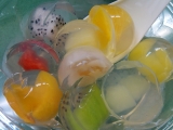 たびたび登場の、ローソンのうちカフェシリーズです今日食べたのは、9種類の果物のスイーツドラゴンフルーツ、オレンジ、スイカ、りんご、黄桃、マンゴー、キウイライチ、パイナップルそれがゼリーの中に入っていて見るからに、涼しげできれいでかわいいカロリーも低いし、さっぱりしてこういう季節にぴったりで… 2011/07/12