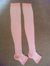 ふっとらくファンサイト参加中立ち仕事なので脚の浮腫みが毎日酷い!;;何とか改善できないかと思っていたところに素敵なお届け物♪パソコンの上ですみません…私はクリーム色にしました*以前膝丈のものは使ったことがあるのですが、こちらは太ももまであって足全体をスッキリできそうです♪写真が横ですが…履くとこんな… 2012/10/09