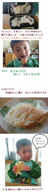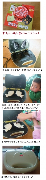 モニプラさんで いいもの王国さんの電気たい焼き器が当選しました じつは、このたい焼き器が届いたのは、あの大きな地震の次の日・・・ なかなか たい焼きを楽しむという気持が出なくて、1ヶ月も経ってしまいました リビングに飾られた、たい焼き器を見ては… 2011/04/11