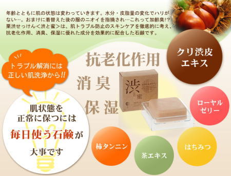 この度、加齢臭・体臭に悩んでいる方のために(※)「栗渋」を使った全く新しい消臭+抗老化石鹸を製薬会社と共同開発した、栗渋せっけん「渋と蜜」をご紹介いたします。