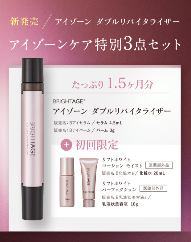 アイゾーンケア特別3点セット ①アイゾーン ダブルリバイタライザー スティックタイプの目もとケア化粧品。日本初※1のロールオンセラムとリッチバームの2in1タイプ。 ※1 スティックタイプの目もとケア化粧品において、容器がロールオンとスティックバームの組み合わせでの2in1タイプとなっている日本初、日本で唯一の商品(TPCマーケティングリサーチ(㈱)調べ:2023年6月時点) ②リフトホワイト ローション モイスト 深いうるおいで肌を満たしながら、次に重ねる美容液をぐっと引き込む※2 化粧水 ③リフトホワイト パーフェクション 美容液(成分を引き込む※2)と乳液(柔らかく整え守る)の機能が1つになった乳液状美容液 ※2 角層まで レビュー数 : 30 |