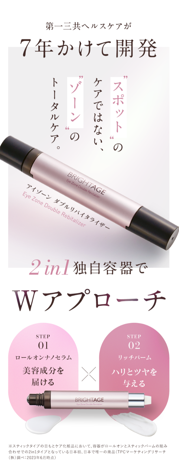 ※1 スティックタイプの目もとケア化粧品において、容器がロールオンとスティックバームの組み合わせでの2in1タイプとなっている日本初、日本で唯一の商品(TPCマーケティングリサーチ(㈱)調べ:2023年6月時点)