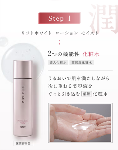 BRIGHTAGE リフトホワイト ローションモイスト&パーフェクション セット 製薬会社である第一三共ヘルスケア開発のエイジングケア※1 美白有効成分トラネキサム酸に加え、肌荒れ防止有効成分グリチルリチン酸2Kも配合 さらに24種類の美容成分で大人肌の複数悩みへ全方位アプローチ ①リフトホワイト ローション モイスト深いうるおいで肌を満たしながら、次に重ねる美容液をぐっと引き込む化粧水 ②リフトホワイト パーフェクションハリ・美白※2・高保湿にアプローチするその名もパーフェクトな乳液状美容液 ※1年齢に合わせ、ハリ・美白(※2)・保湿を考えたお手入れのこと ※2 メラニンの生成を抑え、しみ・そばかすを防ぐ。 レビュー数 : 50 |