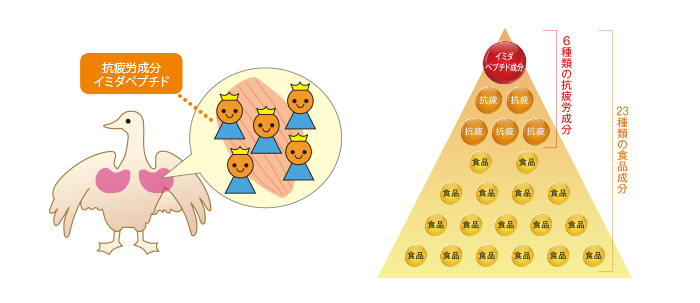 文部科学省研究班からスタートした研究総予算約30億円のプロジェクトでは、2003年-2006年の産官学連携プロジェクトにて、まず『元気の源になるもの』とイメージされる食品成分を23種ピックアップ。それから綿密な研究を重ねることで、疲労に対する有用性が確認できる6種の成分を発見。その中でも、高い有用性が顕著に現れた成分が鳥胸肉に多く含まれる「イミダゾールジペプチド」でした。