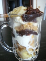先日「あんことバナナの春巻き」を作って残ったあんこを使い、ミニパフェを作りました あんこ、バニラアイス(「ハーゲンダッツ」のミニカップ)、玄米フレーク、バナナを交互にのせていくだけあんこをうまく使い切り、おいしくいただけました 井村屋 モニプラ王国ファンサイト応援中 2010/08/23