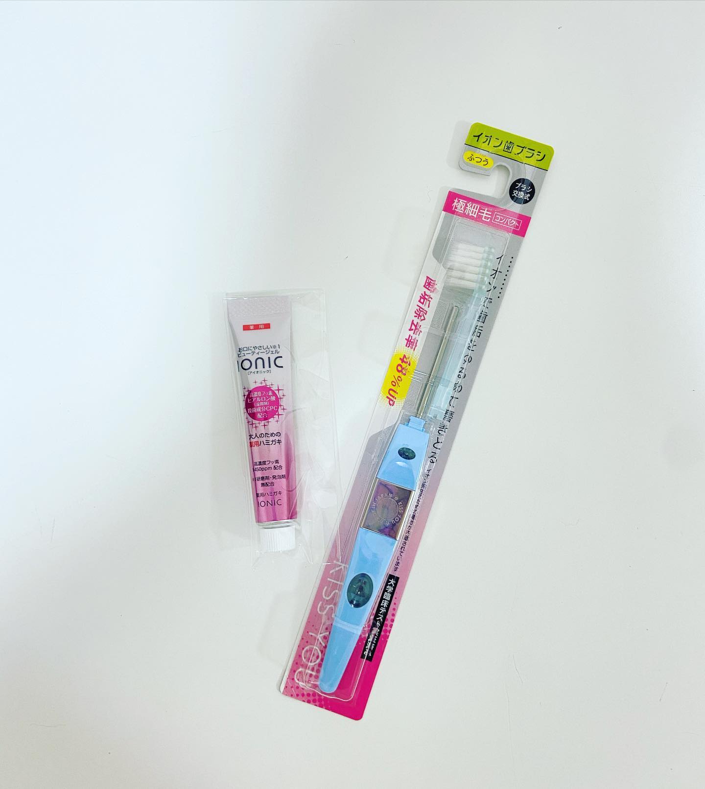 画像がうまく表示されていなかったため 再投稿失礼します🙇♀️ ⋈・。・。⋈・。・。⋈・。・。⋈ アイオニックビューティジェル& キスユー極細コンパクト本体ふつうを 試してみました😊 キスユーの歯ブラシは、以前 アイオニックビューティーを 試させていただいたのですが どちらもイオンを発生させて磨く 新しいタイプの歯ブラシです😊 どちらも替えブラシでブラシ交換できますが 替えブラシはどちらの本体にも共通して 使用できます✨ 電池が内蔵されており ボタンを押して電池残量を確認できます😊 今回は極細コンパクトなヘッドを 使用したのですが細かい隙間まで 磨きやすいです👏 以前もご紹介した アイオニックビューティジェルをつけて 磨くことで、徐々にですが 染み付いていた着色汚れが落ちてきて 白い歯に近づいてきた気がします🥰 もうこれからはキスユーの歯ブラシしか 使えないかもしれません😂 気になった方はぜひ試してみてください😊✨ ⋈・。・。⋈・。・。⋈・。・。⋈ 🎀🎀商品紹介🎀🎀 ◆キスユー極細コンパクト本体ふつう◆ 内蔵電池によるマイナスイオンの効果で 虫歯・歯周病・口臭の原因である 歯垢を効率よく落とすと同時に イオンの働きで歯茎をイキイキさせる 健康歯ブラシです。 取り換え可能なブラシヘッドも 山切りカット、極細、極細ワイド、フラット 子供用,ワンタフト等各種ご用意し 相互に付け替えも可能。 ◆アイオニックビューティジェル◆ 湿潤剤としてヒアルロン酸を加えており ドライマウス対策やドライマウスに伴う 口臭対策に効果的です。 研磨剤、発泡剤を無配合することにより お口にやさしく、歯へのダメージ軽減 歯磨き後のすすぎ回数の抑制により フッ素やヒアルロン酸が 口腔内に留まりやすくしています。 CPCが口腔内の浮遊性細菌を長時間殺菌。 1450PPMの高濃度フッ素を配合し 虫歯予防の効果を高めています。 PEGがタバコのヤニを除去 メタリン酸Naが着色汚れを浮かせて 落としやすくします。 ヒアルロン酸、ソルビット液 濃グリセリン配合で、お口の中の潤いを保ち ドライマウス対策に。 イオン歯ブラシとの併用で相乗効果。 #アイオニックビューティー #ハミガキ #キスユー #マイナスイオン #ヒアルロン酸 #monipla #ionic_fan #懸賞好きさんと繋がりたい #モニター好きと繋がりたい #美容垢さんと繋がりたい #美意識高い人と繋がりたい #ママさんと繋がりたい #おしゃれママさんと繋がりたい #美容オタクさんと繋がりたい