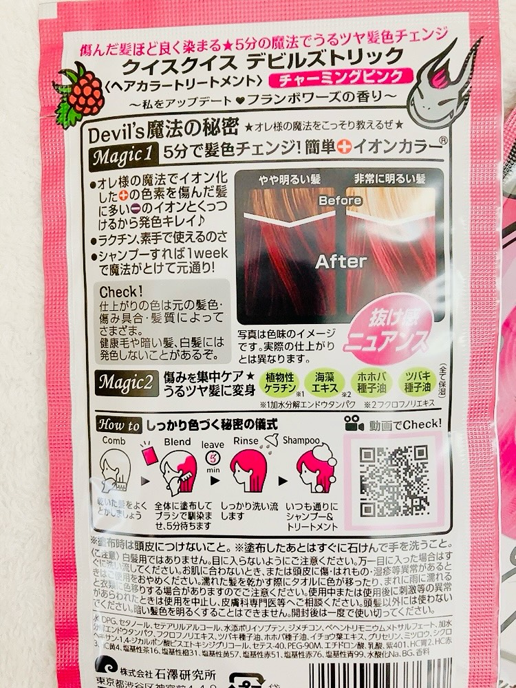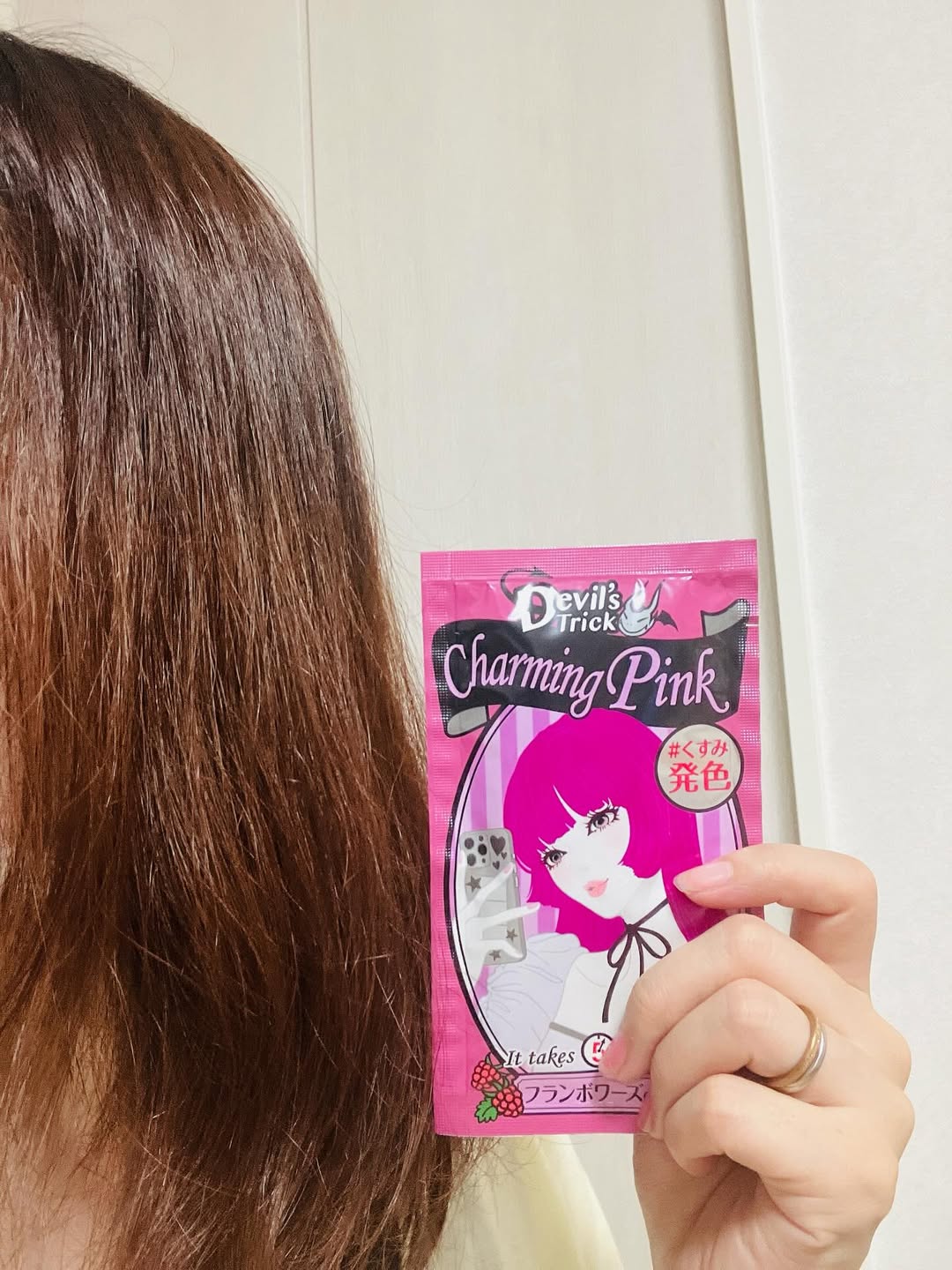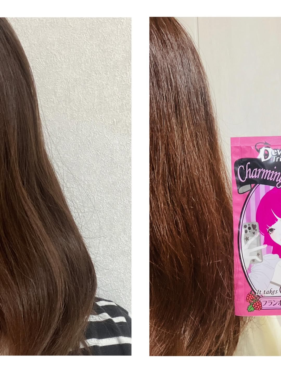\約1週間で元通り♪高発色カラートリートメント/ 「クイスクイス デビルズトリック チャーミングピンク」 傷んだ髪ほど よく染まるヘアカラートリートメント。 約1週間でもとの髪色にもどるそうで、 気軽に髪色チェンジが楽しめちゃう♪ 「おしゃれで大人っぽいカラーを 楽しんでみたい!」 「髪を染めてみたいけれど、 インパクトのある派手髪に染めるのは 勇気がいる‥」と思っている方にぴったり! 素手でOKという手軽さも嬉しい! 早速染めてみました! 甘すぎないフランボワーズの香りがいい香り♪ 5分できちんと染まるか不安でしたが、明るい髪色になりました! さすがにプリンの黒髪には染まりませんでしたが、傷んだ髪には◎ 他のカラーも気になってきました♪ #PR #石澤研究所 #デビルズトリック #カラートリートメント #ヘアケア #セルフカラー #抜け感 #インナーカラー #ヘアカラー #チャーミングピンク #ヴィンテージベージュ #ミスティックブルー #ニュアンスカラー #くすみカラー #monipla #ishizawalab_fan