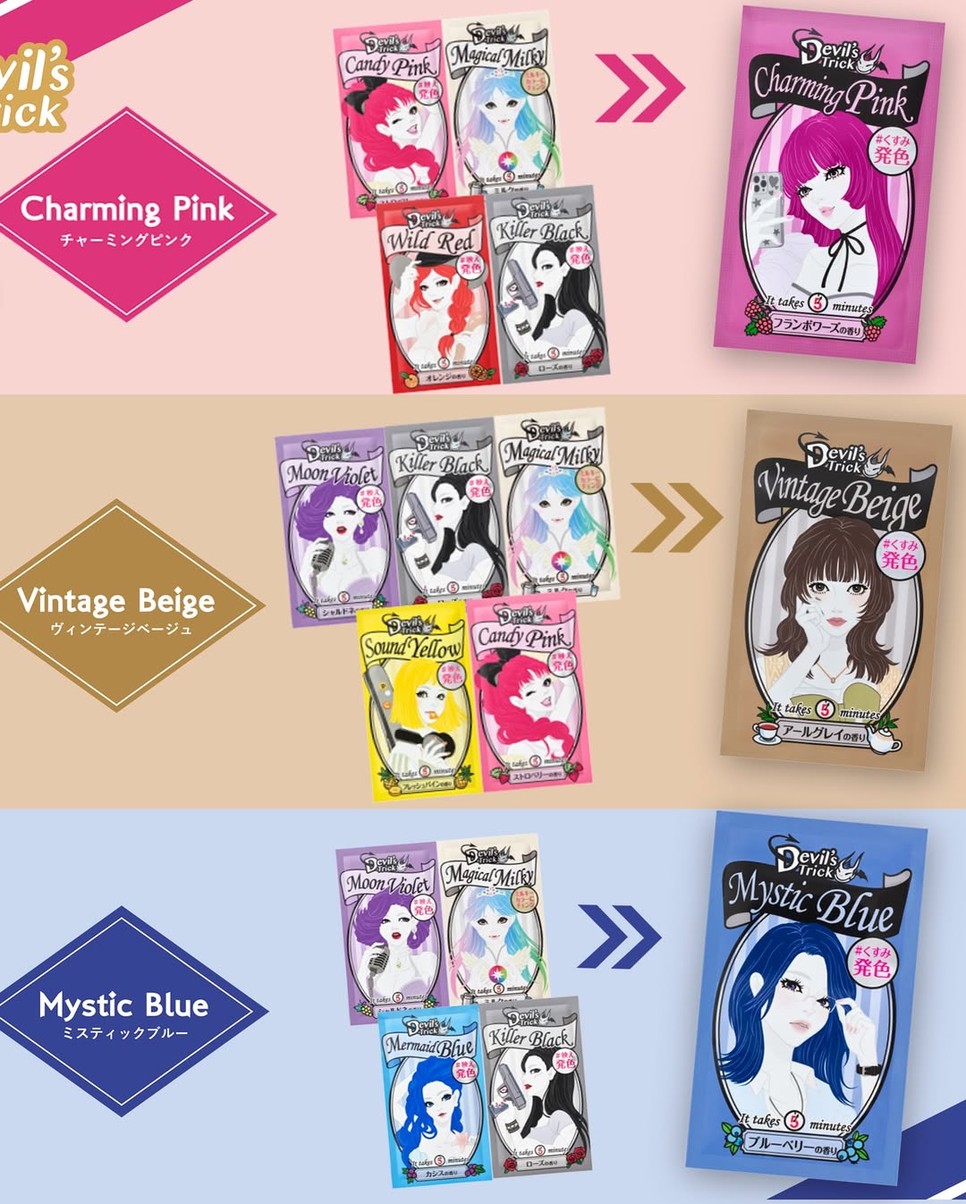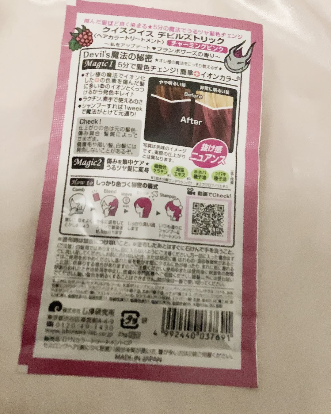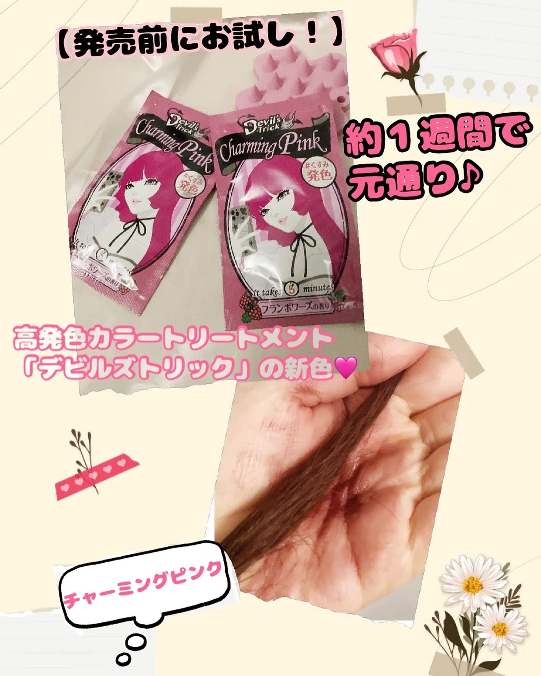 【発売前にお試し!】 約1週間で元通り♪ 高発色カラートリートメント「デビルズトリック」の新色 @ishizawalab もう何度も愛用中♡ 新しいワタシ色に髪色チェンジ!傷んだ髪ほど よく染まるヘアカラートリートメント。 素手でOK、塗って5分でサロンに負けない発色! さらに、トリートメント効果で傷みを集中ケア。 約1週間でもとの髪色にもどるから、 気軽に髪色チェンジが楽しめます。 そんなデビルズトリックから 新色のニュアンスカラー 3種類が登場!! 「おしゃれで大人っぽいカラーを 楽しんでみたい!」という方や、 「髪を染めてみたいけれど、 インパクトのある派手髪に染めるのは 勇気がいる‥」と思っている方にぴったりの、 程よいくすみと抜け感を感じられる、 まるでサロンで染めたようなおしゃれ絶妙カラーです。 #くすみ発色で抜け感を◎ 新登場のニュアンスカラーについて♪ ✅既存のデビルズトリックのカラーを 混ぜて作られた“抜け感アッシュ” 新登場の3色は 既存のデビルズトリックのカラーを 混ぜて作られています。 『クイスクイス デビルズトリック』で 髪色の着せ替えを楽しんでみませんか? ✅素手でOK!簡単+イオンカラー® イオン化した+の色素が 傷んだ髪に多い-イオンとくっつくから たった5分で発色キレイ♪ シャンプーすれば1weekで 魔法がとけて元通り! 傷みを集中ケア★うるツヤ処方 ニュアンスカラーには、 既存のデビルズトリックに配合されている、 「ホホバ種子油(保湿)」 「ツバキ種子油(保湿)」に加え、 「植物性ケラチン*1」「海藻エキス*2」が 配合されています。 植物性ケラチン*1は、保水力を高め、 海藻エキス*2はキューティクルを補修し、 つや髪に導きます。 「イオンカラー®」は株式会社石澤研究所の登録商標です。 *1 加水分解エンドウタンパク *2 フクロフノリエキス 私が使ってみたのはチャーミングピンク🩷 来月のライブの時に全頭やりたいから今回は毛先だけで🙏 乾いた髪をよくとかし、 そのまま全体に塗布。 目の粗いブラシでなじませて待つこと5分。 しっかり洗い流したら、 あとはいつも通りシャンプー&トリートメントするだけ。 ※塗布時は頭皮につけないようにご注意ください。 ※塗布したあとはすぐに石けんで手を洗ってください。 ※1袋でセミロング(肩につく程度)1回分。 髪が長い方、量が多い方は2袋ご用意ください。 #PR #石澤研究所 #デビルズトリック #カラートリートメント #ヘアケア #セルフカラー #抜け感 #インナーカラー #ヘアカラー #チャーミングピンク #ヴィンテージベージュ #ミスティックブルー #ニュアンスカラー #くすみカラー #monipla #ishizawalab_fan #ピンク髪 #ピンクヘアー #8号車