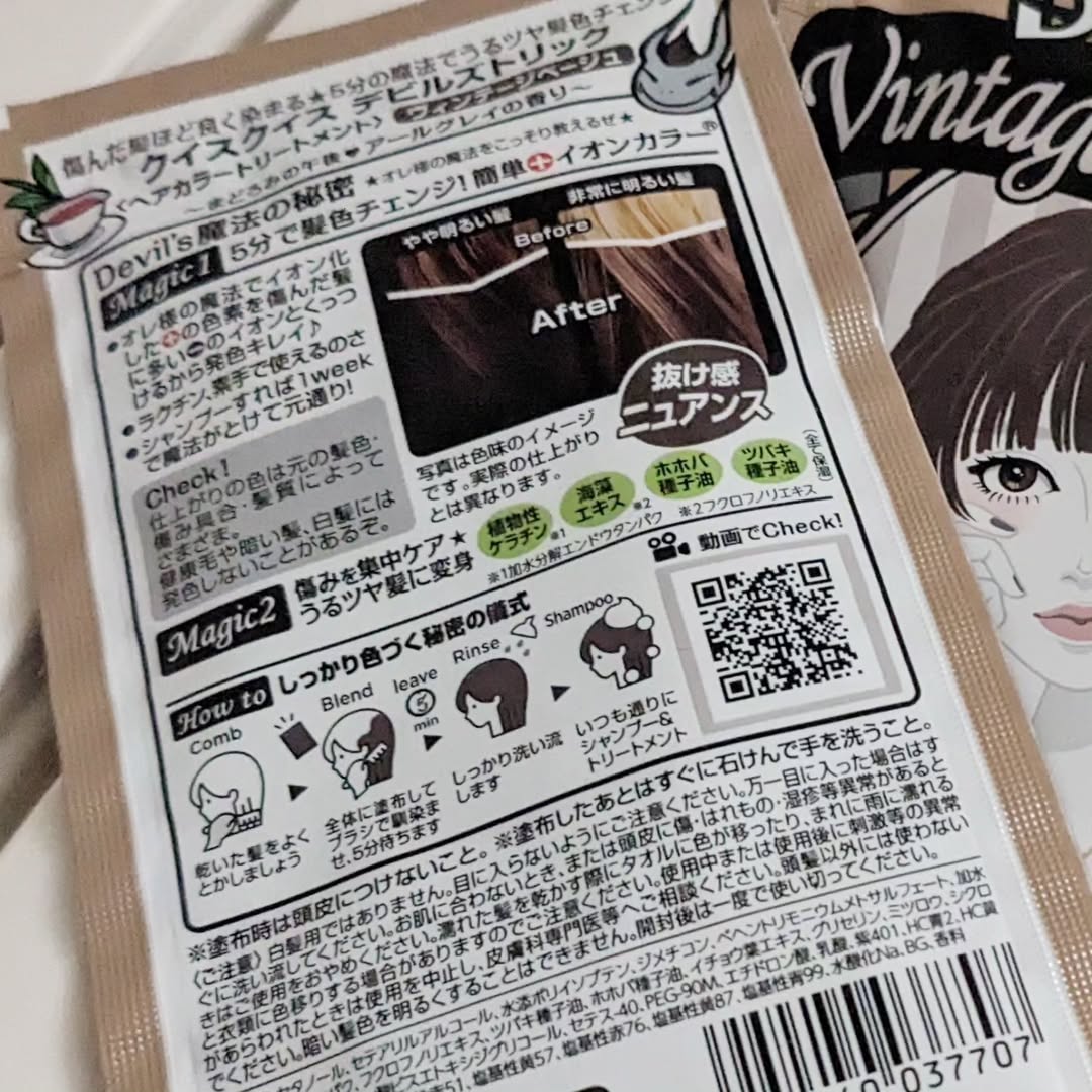 クイスクイス デビルズトリック ヴィンテージベージュ 使ってみました 素手で塗って5分でOKなのでとても気軽です。 トリートメント効果で傷みを集中ケアで、傷んでいる髪ほどしっかりと染まります。 1週間ほどで色も抜けるので、ちょっと気分を変えたいときにおすすめ! 自宅ですごく気軽にちょっと染められるのが楽しかった♪ #PR #石澤研究所 #デビルズトリック #カラートリートメント #ヘアケア #セルフカラー #抜け感 #インナーカラー #ヘアカラー #チャーミングピンク #ヴィンテージベージュ #ミスティックブルー #ニュアンスカラー #くすみカラー #monipla #ishizawalab_fan