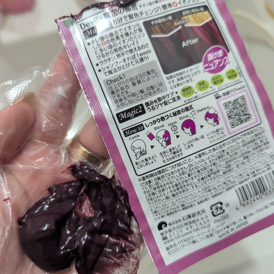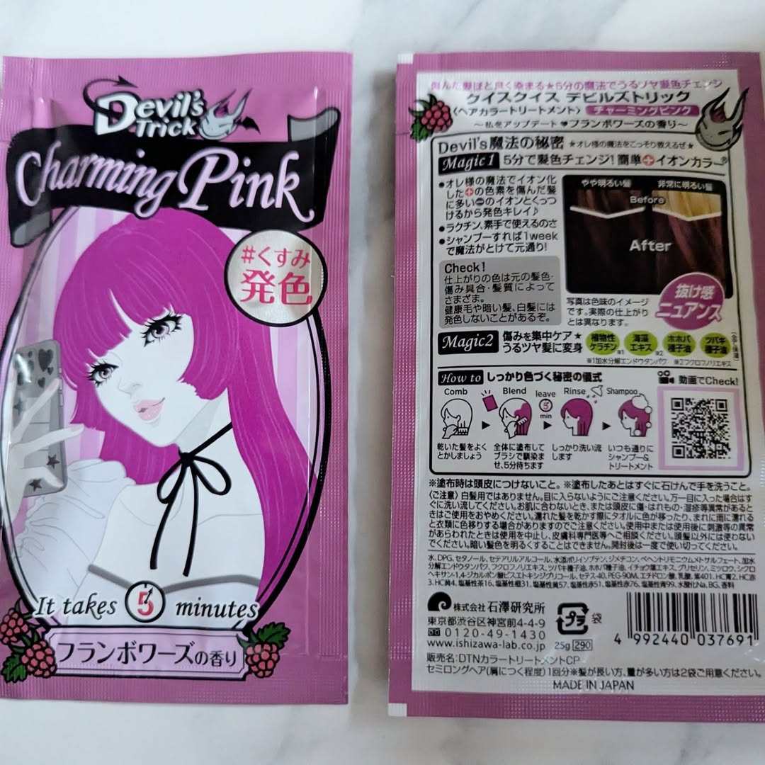 クイスクイス デビルズトリック ニュアンスカラー チャーミングピンク フランボワーズの香り ※ 5分で髪色チェンジ✨ 🪄マジック① 簡単+イオンカラー 🪄マジック② 痛みを集中ケア うるツヤ髪に変身 ※ ひと袋では私の髪は全体は足りませんでした。 でも、良い香りで 少しは色づいてると思います🩷 気軽にカラーチェンジしたい方にオススメです✨ ぜひ、使ってみてくださいね♪ ※ #PR #石澤研究所 #デビルズトリック #カラートリートメント #ヘアケア #セルフカラー #抜け感 #インナーカラー #ヘアカラー #チャーミングピンク #ヴィンテージベージュ #ミスティックブルー #ニュアンスカラー #くすみカラー #monipla #ishizawalab_fan