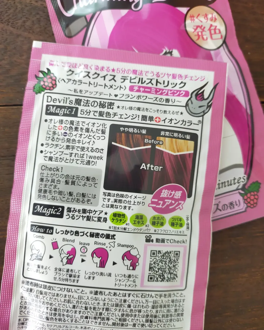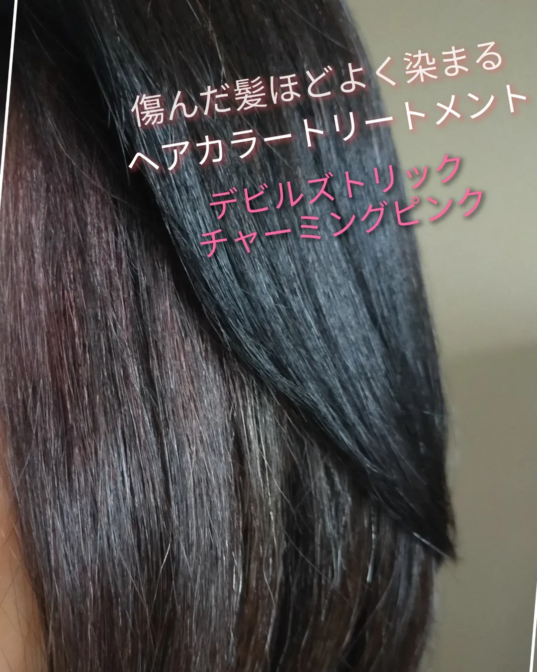 傷んだ髪ほど よく染まる🖍 高発色カラートリートメント 「クイスクイス デビルズトリック」 新色ニュアンスカラー <チャーミングピンク>使用 デビルズトリック、 思った以上に色を感じられる😆 白髪染めを頻繁にしてるから 髪はかなり乾燥してる状態💧 白髪が目立つ根元や髪の内側は ピンクがキレイに入りました。 もとの髪色が暗めの部分は 外で見るとピンクがかってる感じで ヘアマニキュアのような仕上がり。 明るめの髪色だったら しっかり色味を感じられると思う。 香りが良く ヘアカラーほど気を使わないので (手で塗ってもOK) (地肌についても石鹸で落ちる) デビルズトリックリピーターです💕 ”約一週間で元通り” 私の髪だと一週間以上もつ感じ。 傷んでるから色が入りやすいのかも。 髪の質感も良くなるみたい。 色遊びはもちろん カラーの退色が気になるときにもおすすめ😊 #PR #石澤研究所 #デビルズトリック #カラートリートメント #ヘアケア #セルフカラー #抜け感 #インナーカラー #ヘアカラー #チャーミングピンク #ヴィンテージベージュ #ミスティックブルー #ニュアンスカラー #くすみカラー #monipla #ishizawalab_fan