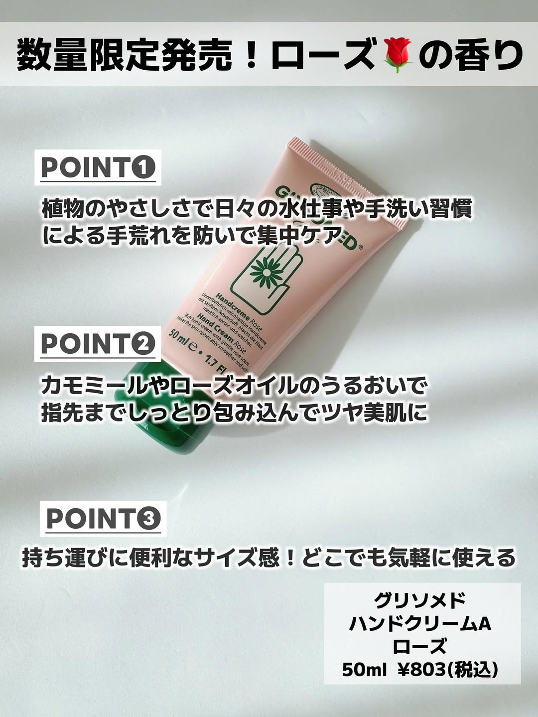 他の投稿をみる ▷▷@nagi_skin_care グリソメド ハンドクリームA ローズ 50ml ¥803(税込) 数量限定発売のローズ🌹の香りの ハンドクリーム💓 カモミール、ローズオイル配合で 指先までしっとり包み込んで ハリ不足の乾燥肌をツヤ美肌に してくれる✨ 優しく広がるローズの香りが すごく癒される😊 柔らかいクリームなのでしっかり 伸びて塗り心地はとっても良い👏🏻 しっとりして保湿力も抜群💓 これからの季節ほんとありがたいです🙏 是非チェックしてみてください☑︎ #PR #石澤研究所 #グリソメド #ハンドクリーム #ハンドケア #保湿ケア #乾燥ケア #ローズ #数量限定 #monipla #ishizawalab_fan