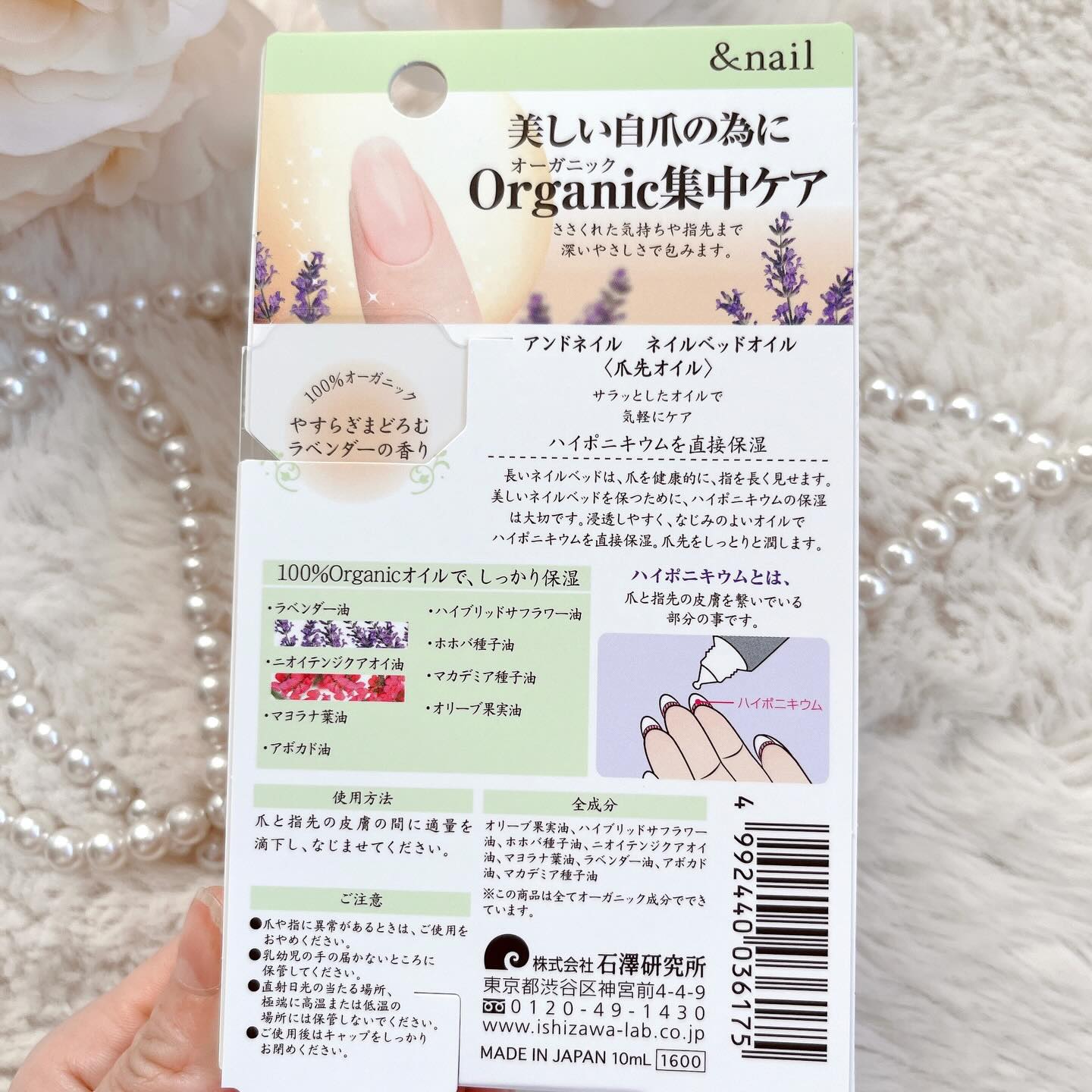 𓈒𓏸┈┈┈┈┈┈✾┈┈┈┈┈┈𓏸𓈒 &nail(アンドネイル) ネイルベッドオイル<爪先オイル> 爪と指先の皮膚をつなぐハイポニキウムを 直接保湿してくれる 100%オーガニックの爪先オイル 爪と指先の間に直接オイルを落とす スポイトタイプの爪先オイル ネイルベッドを育てたくて、ネイルケアをしていましたが ハイポニキウムに直接塗れるオイルなんて画期的! サラリとしたテクスチャーで 馴染みがよく1滴ちょんと落として くるくるとするとスっと馴染んでいきます コンパクトで邪魔にならないサイズなので 持ち運びにも便利だし、気になる時にサッと塗れます 爪が縦長だと手がキレイに見えるので しっかり浸透してくれるように 寝る前のネイルケアとして使っています ほんのりやさしいラベンダーの香り ラベンダー油、ニオイテンジクアオイ油、 マヨラナ葉油、アボカド油、 ハイブリッドサフラワー油、ホホバ種子油、 マカデミア種子油、オリーブ果実油 の8種類のオーガニックオイルがしっかり潤してくれます 製品名:アンドネイル ネイルベッドオイル 容量:10mL 価格: 1,760円(税抜 1,600円) #PR #石澤研究所 #アンドネイル #ネイルベッドオイル #ネイルケア #自爪ケア #ネイル #ハイポニキウム #オーガニック #保湿 #オーガニックコスメ #monipla #ishizawalab_fan