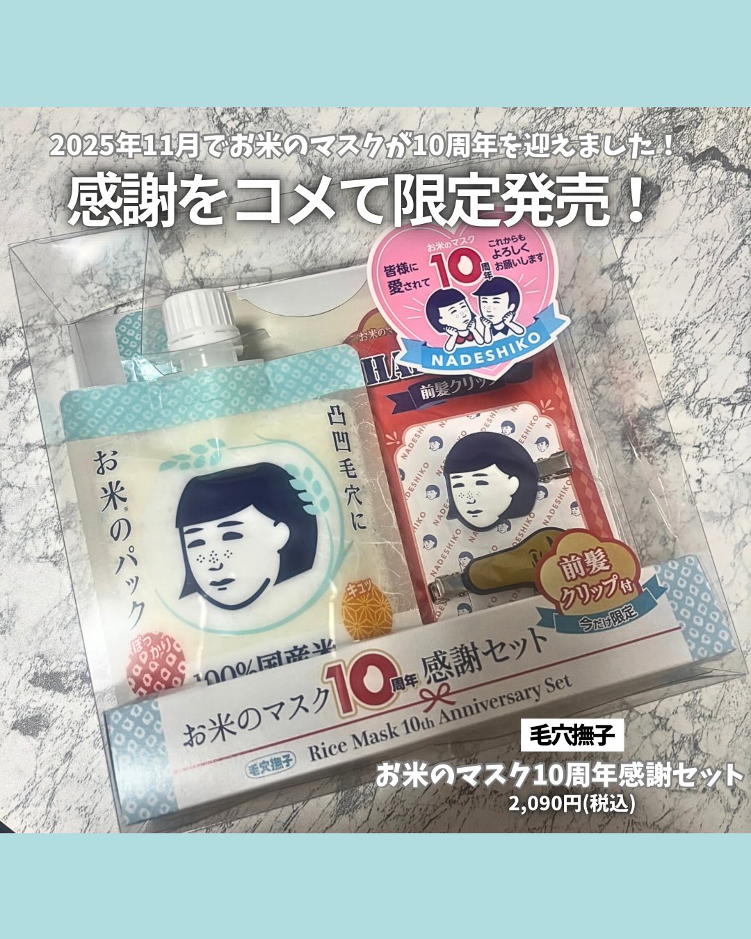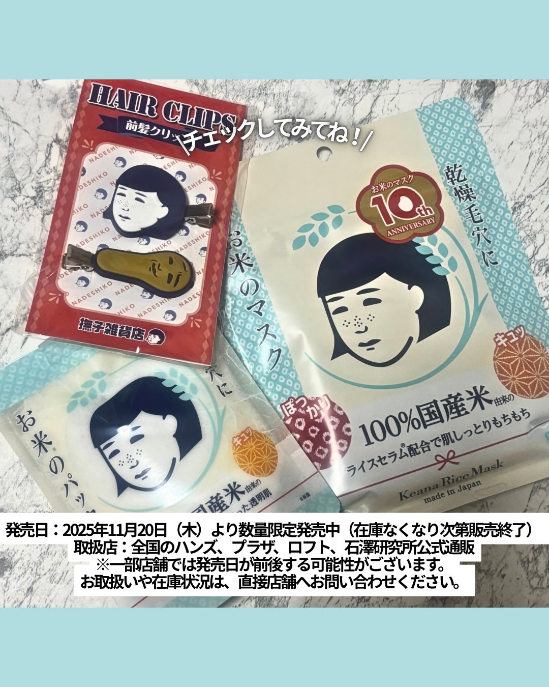 モニター当選🎉 @ishizawalab 様ご提供ありがとうございます😭🩷 みんな知ってる大人気の毛穴撫子のお米のマスクが今年の11月で10周年を迎えたということで感謝の気持ちをコメて限定感謝セットが発売💫 🎀毛穴撫子 お米のマスク10周年感謝セット 2,090円(税込) 【セット内容】 ①お米のマスク(シートマスク) 100%国産米由来成分配合の厚手でうれしい日本製シートマスク!美容液をたっぷり含んだ肌あたりのやさしいシートが、お肌にぴたっと密着🩷キメをふっくら整えて、指が吸いつくほどもっちりした肌に✨ 毛穴の目立たない「毛穴無子(けあななしこ)」ちゃん肌の出来上がり😌🫶 ②お米のパック(洗い流すパック) うるおい不足のカサカサ肌は、キメが乱れて毛穴は凸凹、 放っておくと透明感を失って毛穴が目立つくすんだ肌に…💦 そんな毛穴肌に、炊きたてご飯みたいなまっ白パックをひと塗り!洗い流せば、明るさ、パッ!キメの整ったフラットな透明肌に✨ ③オリジナル 前髪クリップ(非売品) レトロでカワイイ、オリジナル前髪クリップ付き🩷 「毛穴撫子」のパッケージでもお馴染みの“撫子ちゃん”と、 お肌に潜んでいる?!毛穴につまる角栓“角栓つめ太郎”の2種類!かわいい💝 洗顔やマスク使用時に便利なアイテム💛 発売日:2025年11月20日(木)より数量限定発売中(在庫なくなり次第販売終了) 取扱店:全国のハンズ、プラザ、ロフト、石澤研究所公式通販 ※一部店舗では発売日が前後する可能性がございます。 お取扱いや在庫状況は、直接店舗へお問い合わせください。 是非チェックしてみてください🫶 #pr #石澤研究所 #毛穴撫子 #お米のマスク10周年感謝セット #monipla