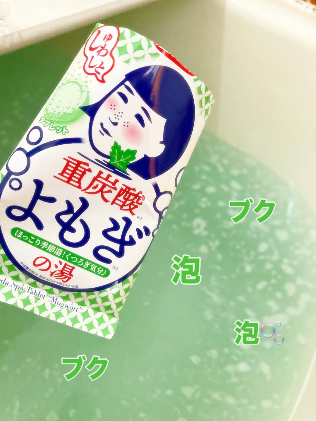 宮崎県産ヨモギエキスを配合したタブレット型入浴剤で、爽やかなヨモギの香りと重炭酸のしゅわしゅわ感でお風呂を温泉気分に変える新商品です🛁🫧