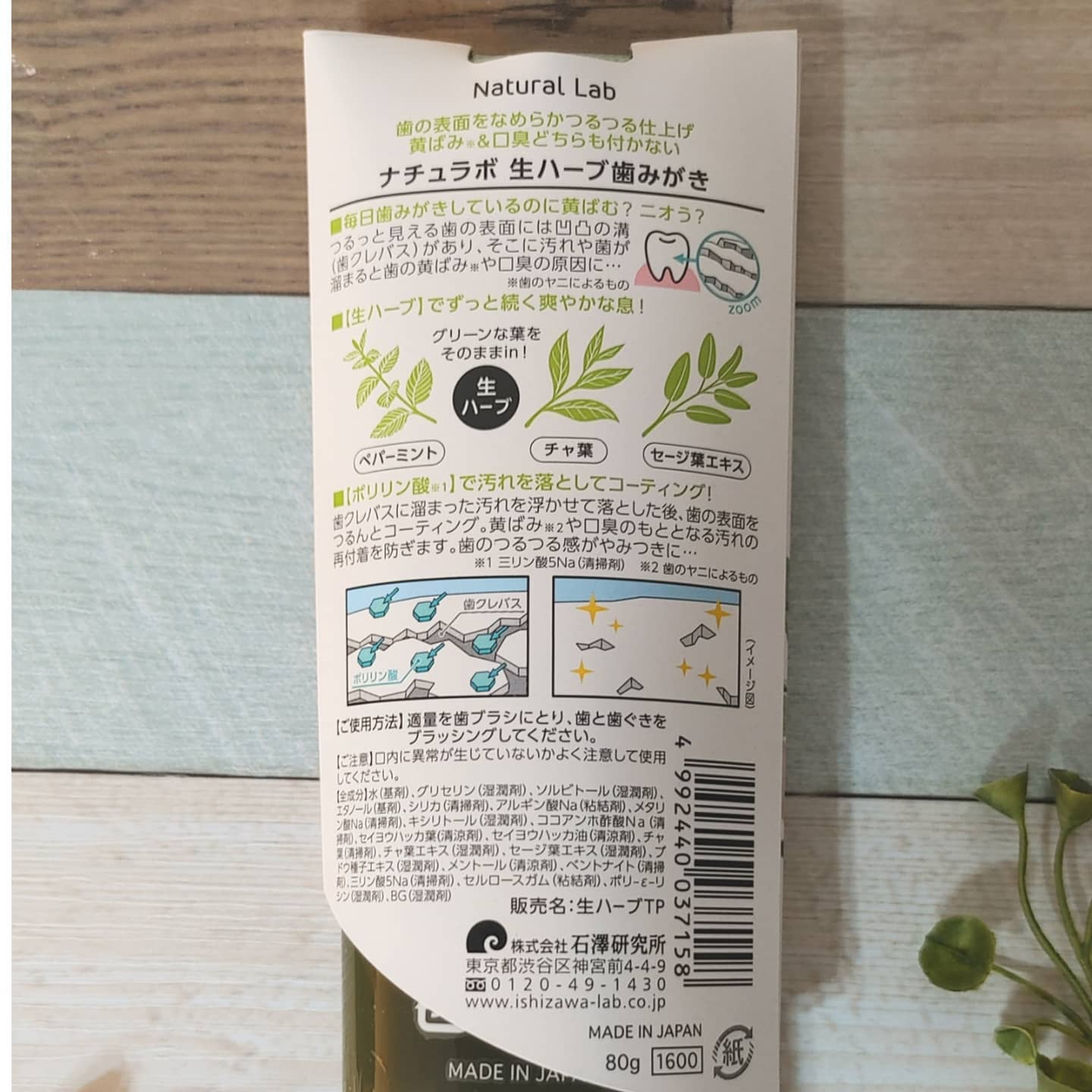■毎日歯みがきしているのに黄ばむ?ニオう? つるっと見える歯の表面には凸凹の溝(歯クレバス)があり、そこに汚れや菌が溜まると歯の黄ばみや口臭の原因に… そんなときは『ナチュラボ 生ハーブ歯みがき』がおすすめ! 生のハーブがそのまま入った歯みがきで歯クレバスに溜まる 黄ばみ※1&ニオイOFF※2。 やみつきになるほどつるつるな磨き上がり。 製品名:ナチュラボ 生ハーブ歯みがき 容量:80g 価格:1,760円(税抜1,600円) 発売日:2021年9月6日(月)※2021年8月26日(木)頃からロフト先行発売 取扱店:全国のバラエティショップ、石澤研究所 公式通販 ※一部店舗では発売日が前後する可能性がございます。 お取扱いや在庫状況は、直接店舗へお問い合わせください。 ▽販売店について https://www.ishizawa-lab.co.jp/shop/