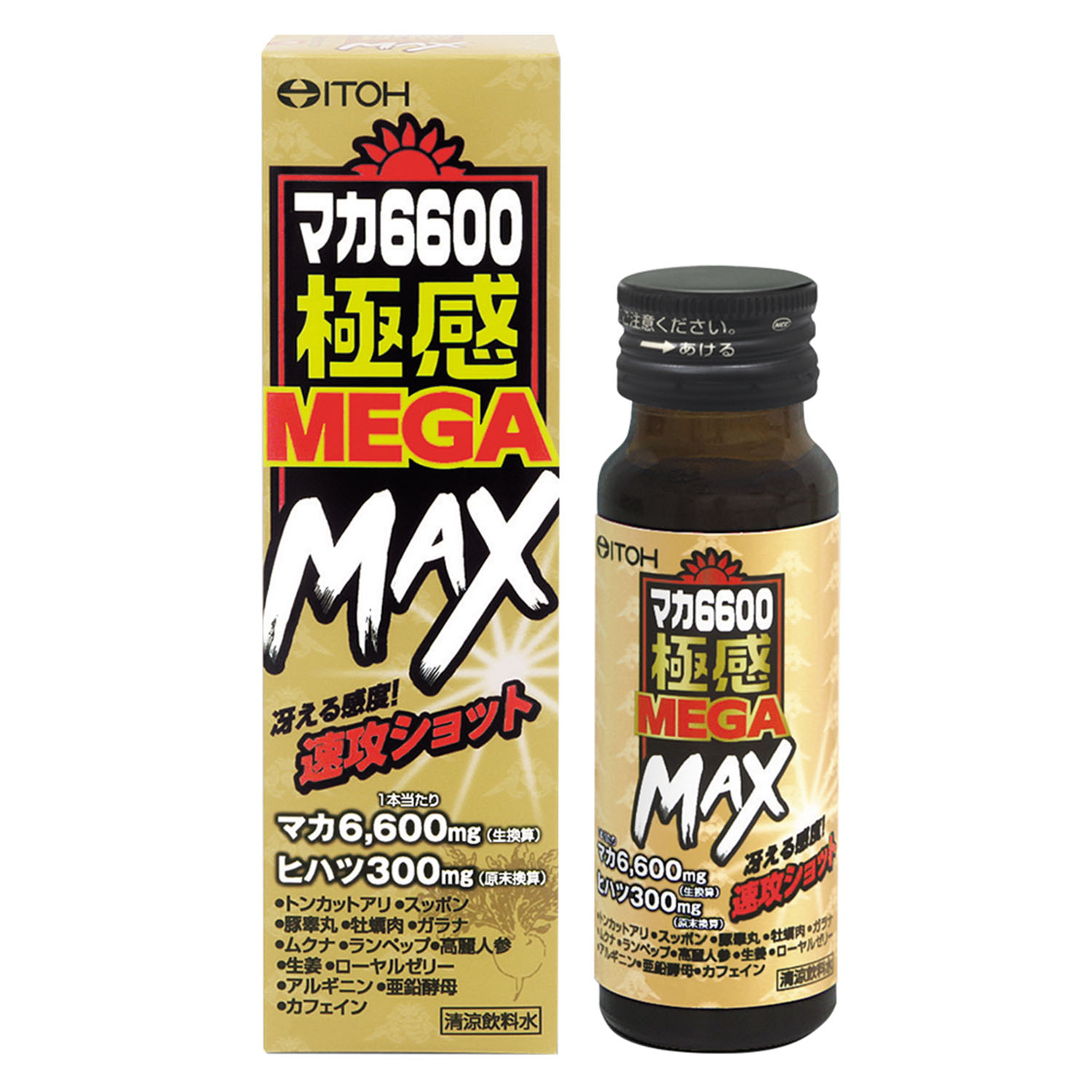 トータル15種類ものパワフル素材を配合した、MEGA MAX級のガツンとした飲み口の極感速攻ドリンク。