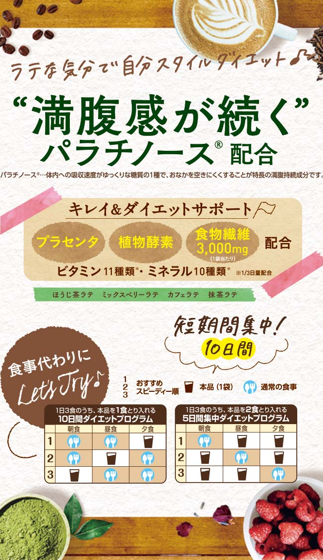 満腹感が続く! 食事代わりに飲むダイエットシェイクです。満腹サポート成分パラチノース、植物酵素、プラセンタ、食物繊維、ビタミン、ミネラル配合で、キレイと健康をサポートします。
