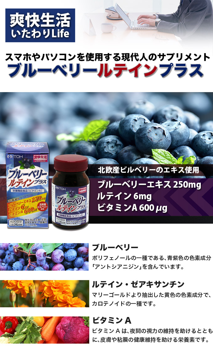 ブルーベリーエキス(北欧産ビルベリーのエキス)250mg、ルテイン6mg、ビタミンA600µg配合(1日当たり)。パソコンやスマホをよく使われる、現代人を応援するサプリです。
