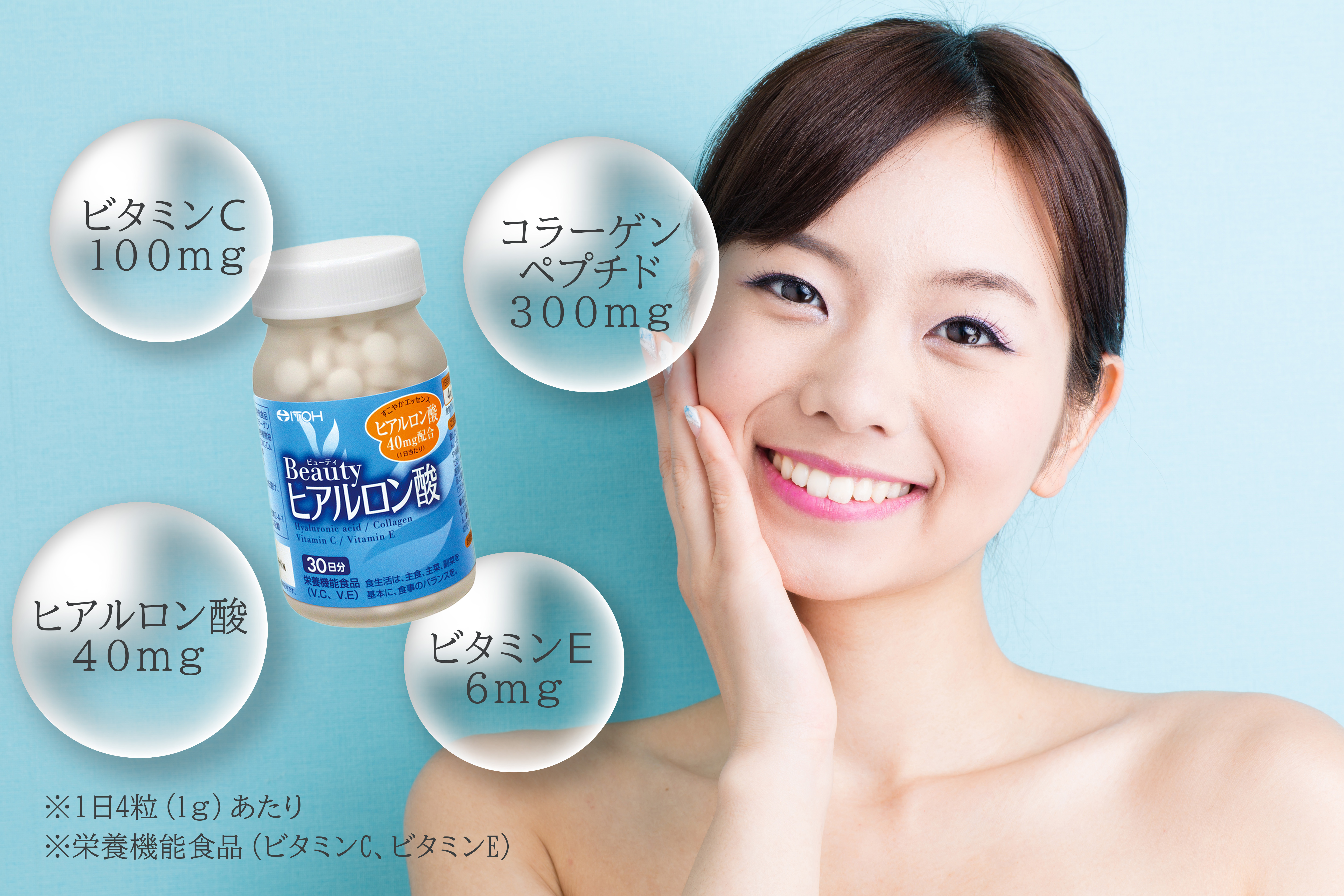 美容にうれしいヒアルロン酸にコラーゲン、ビタミンC、ビタミンEをプラスしたサプリメント。
