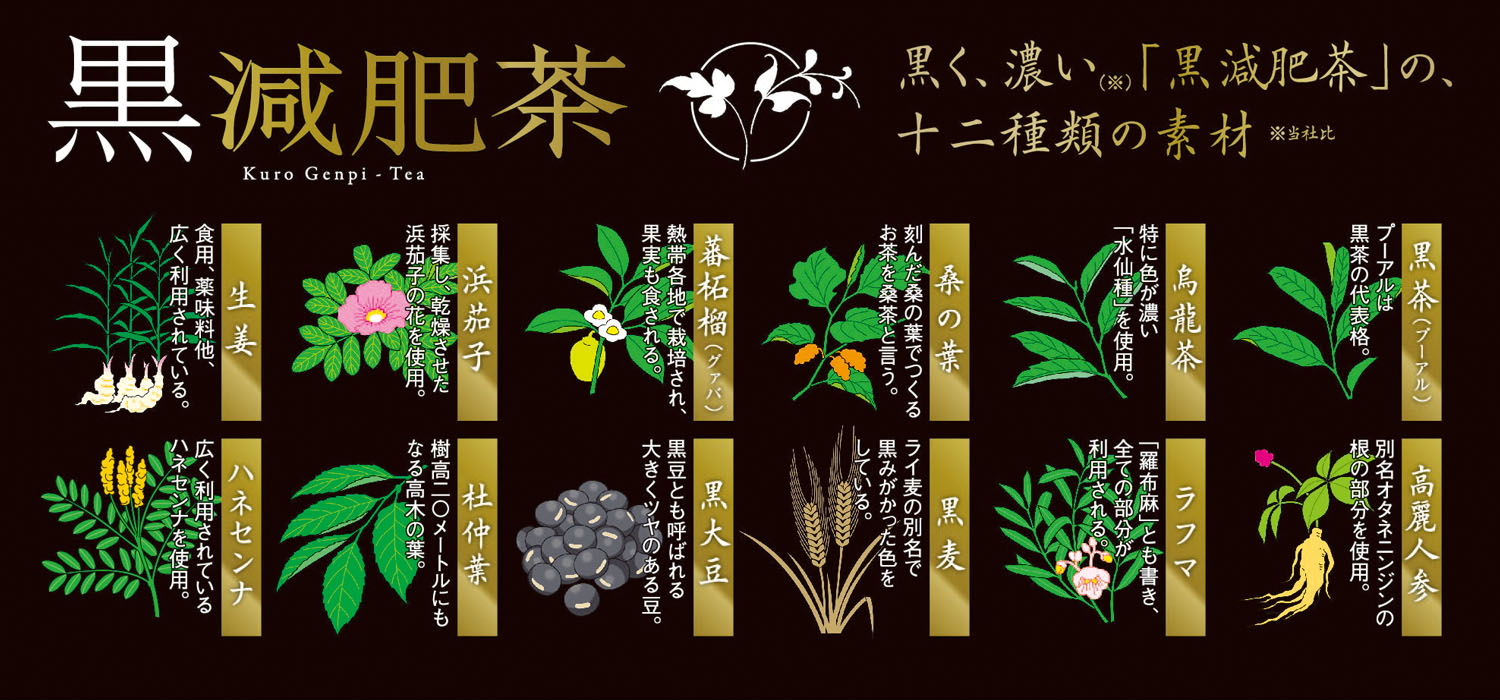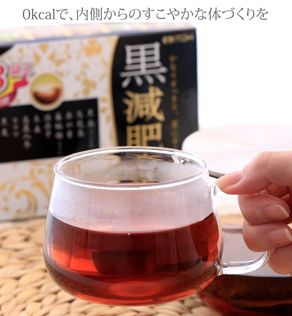 黒茶(プーアル)、烏龍茶をベースに、黒大豆、黒麦などの健康素材をぜいたくに12種類ブレンドしました。飲んで実感、かなりすっきり。0kcalで、内側からのすこやかな体づくりをサポートするダイエット茶です。
