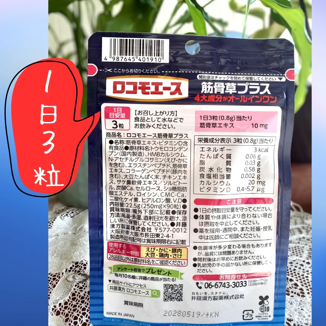 井藤漢方製薬株式会社さまよりご提供いただきました! ★ロコモエース筋骨草プラス 年々、脚への不安が増している私に ぴったりのサプリメントを飲んでいます。 手に取った印象は、あれ、こんなに小さい袋なの?ってこと。 小さいバッグでも入っちゃいそうなほどですよ。 だけど、これで30日分。 しっかり1か月飲めますね。 まず、気になったのは 「筋骨草(きんこつそう)」 しそ科の植物で、古くから健康維持で知られているみたい。 加えて、4大成分がうれしい! 筋肉成分※(ロイシン、イミダゾールペプチド、HMB) 骨成分※(カルシウム、コラーゲン) 軟骨成分※(N-アセチルグルコサミン、プロテオグリカン、ヒアルロン酸) 靭帯成分※(エラスチン) 飲むのは1日3粒です。 この手のサプリはいろいろ飲んだけど、 これだけでいいの~って嬉しくなりました。 さらに、小粒で飲みやすいです。 私は、朝食後に飲むようにしています。 忘れないように習慣にしなくちゃね。 これで半分ほど飲んだところですが、 毎日のウォーキングが楽になってきた気がします。 私の周りでも、脚の不調を訴える人が多くて しっかり歩ける脚を何とか維持したいと思っているんです。 これからも、まだまだ歩いてあちこち出かけたいので、 サプリにサポートしてもらって ウォーキングを続けたいと思います! ※それぞれの組織に存在する成分を含有しています。 #PR #井藤漢方製薬株式会社 #井藤漢方製薬 #ロコモエース筋骨草プラス #monipla #itohkampo_fan