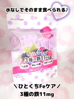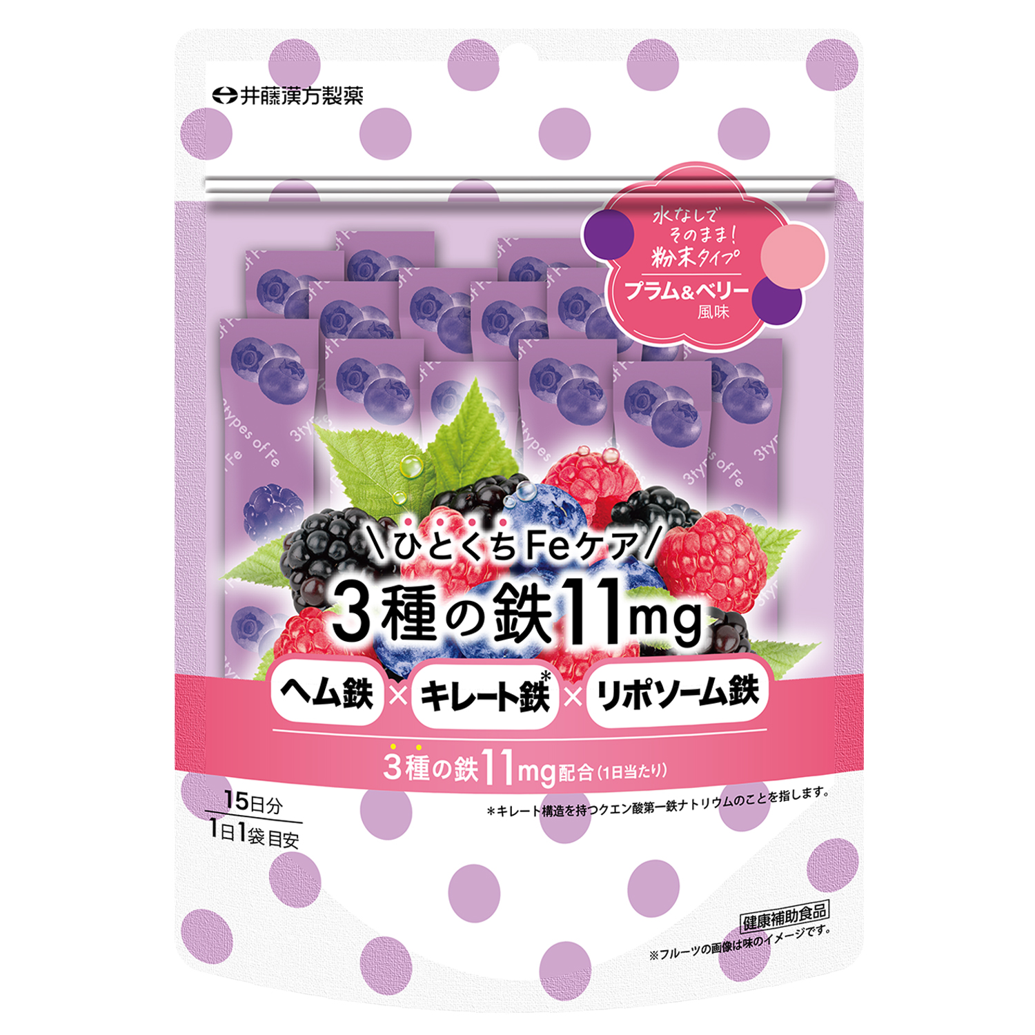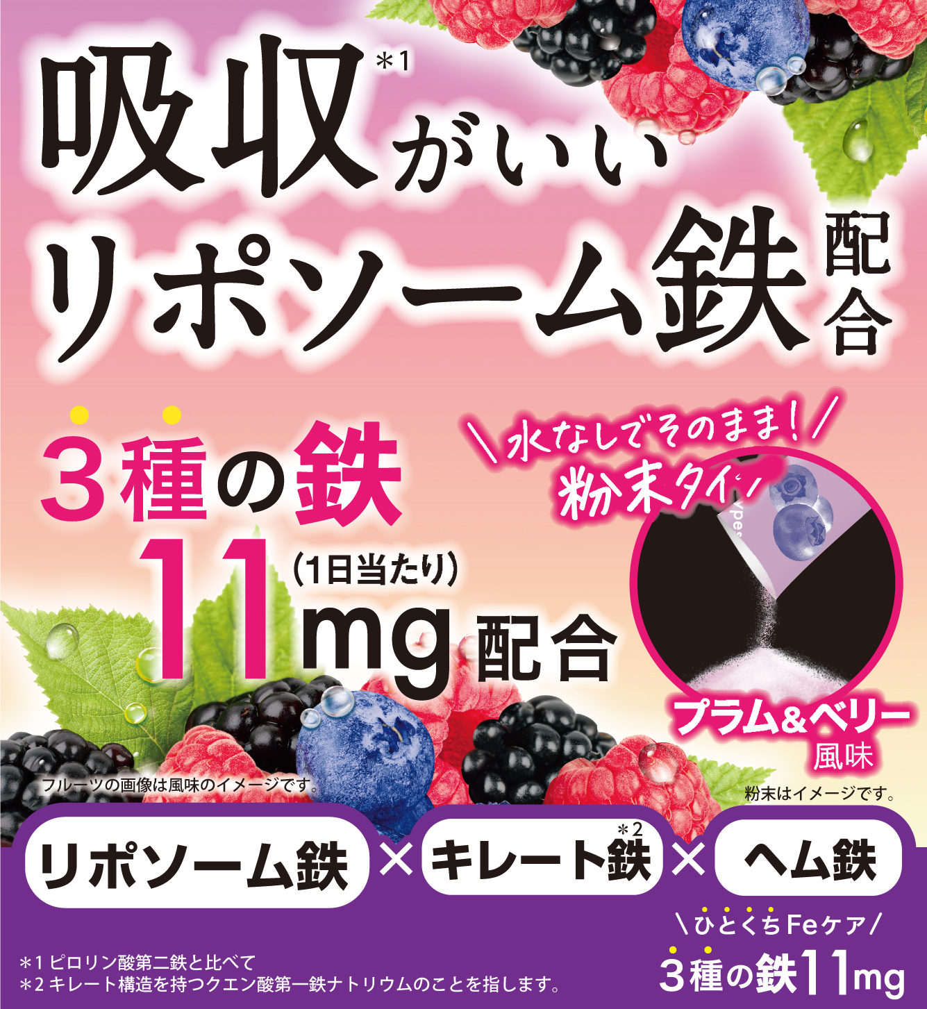3種の鉄をひとつに!1袋に1日分の鉄分11mg*配合しました。プラム&ベリー風味の水なしでそのまま食べられる粉末スティックタイプ。(*対象:成人女性)手軽に持ち歩けるので、毎日の鉄分補給に是非お試しください。