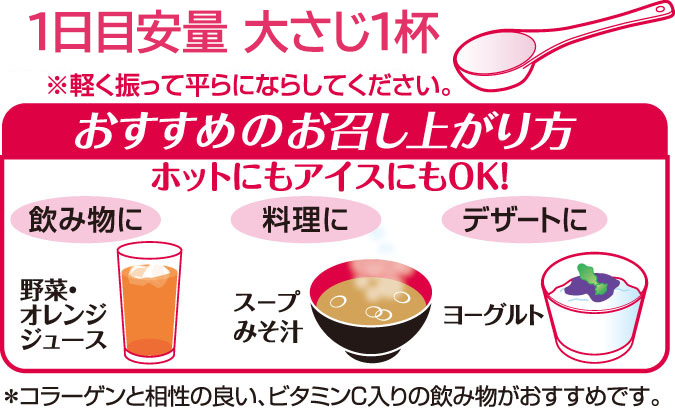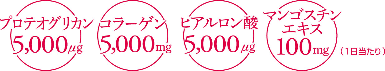 弾む&ハリを感じる毎日に。コラーゲン、ヒアルロン酸にプラスして、サケからとれる美容成分「プロテオグリカン」、「マンゴスチン」の果皮エキスを配合した、贅沢美容パウダーです。お好みの飲み物などに、ホット・アイスどちらでも溶かせる顆粒タイプ。